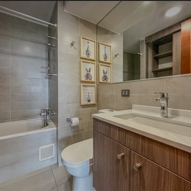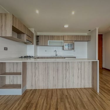COCINA CON ENCIMERA, amoblada y equipada con campana, y horno eléctrico, mesón desayunador con cubierta de marmol, además cuenta con espacio para instalar mesa de comedor.