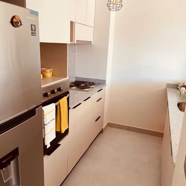 1 cocina amplia concepto semi cerrado-abierto, completamente equipada; horno encimera, campaña